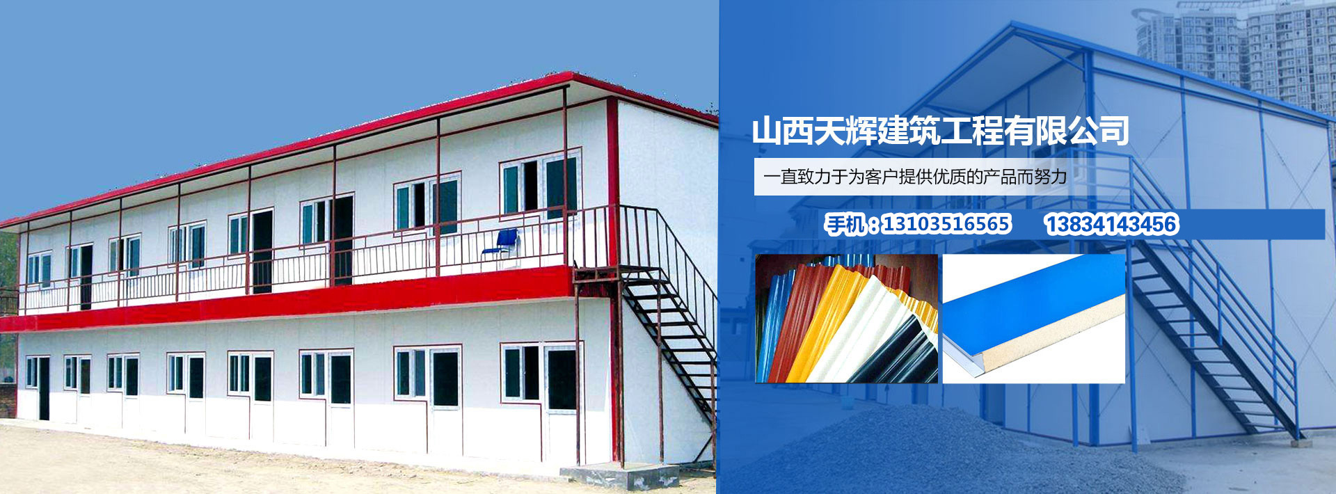 山西天輝建筑工程有限公司是專(zhuān)業(yè)從事彩鋼板生產(chǎn),鋼結(jié)構(gòu)、住人集裝箱、活動(dòng)房設(shè)計(jì)和專(zhuān)業(yè)安裝、維護(hù)的一家企業(yè),我們銷(xiāo)售的產(chǎn)品引進(jìn)全自動(dòng)彩鋼夾芯板流水線(xiàn)以銷(xiāo)售多種規(guī)格的彩鋼復(fù)合夾芯板...